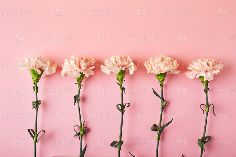 Букет розовых гвоздик. Концепция дизайна праздничного приветствия с букетом гвоздик на фоне розового стола