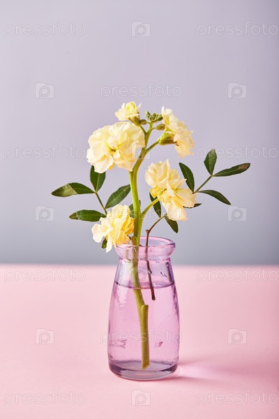 Цветок желтой маттиолы в маленькой стеклянной вазе. Концепция дизайна праздничного поздравления на розовом столе