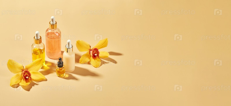 Косметические средства по уходу в стеклянных флаконах с цветами орхидеи - сыворотки, крем, гель, масла. Концепция ухода за лицом и телом, велнес и спа, тропический отдых