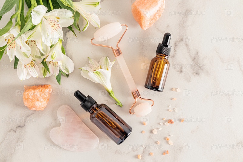 Набор косметики для ухода за кожей лица и тела в домашних условиях. роликовый массажер, масло, гуаша. лимфодренажный массаж. Вид сверху
