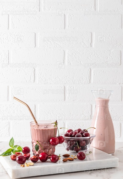 Красивый вертикальный вид натюрморта с вкусным полезным вишневым смузи в бутылке и стакане с экологически чистой соломой. спелые ягоды