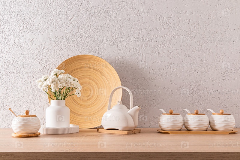 Красивый кухонный фон экологически чистой кухни. Вид спереди на керамические белые банки для хранения, чайник, вазу для цветов. серая цементная стена