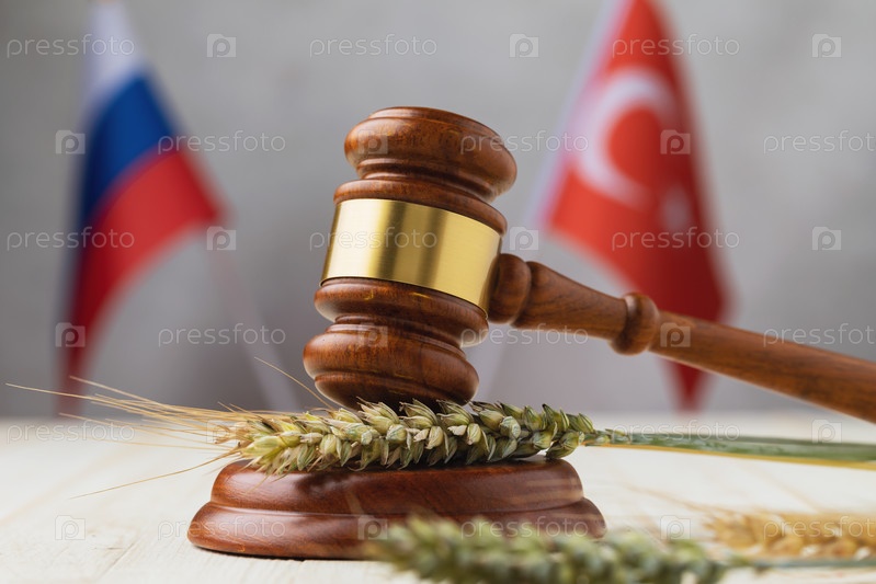 Молот, пшеница, ячменные колосья и флаги стран на столе, концепция на тему зерновой сделки между Россией и Турцией