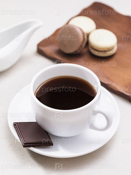 Налитый кофе в белую керамическую чашку, завтрак с шоколадом и макаронами