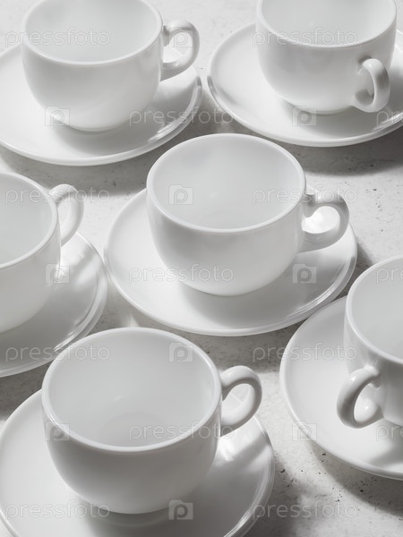 Фон из набора белых керамических блюд, чашек и блюдец для чая или кофе