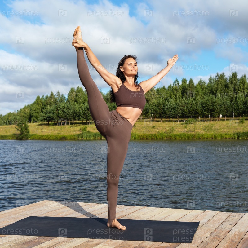 Женщина-практикующая йога, выполняет упражнение Уттхита Хаста Падангуштхасана, балансирует на одной ноге, тренируется в спортивной одежде, стоя на деревянном мосту на берегу озера солнечным утром