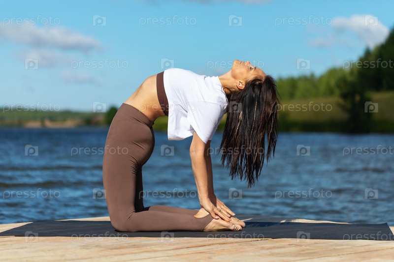 Женщина, практикующая йогу, выполняет упражнение Уштрасана, позу верблюда, тренируется в спортивной одежде в леггинсах и белой футболке на деревянном мосту на озере, солнечно утром