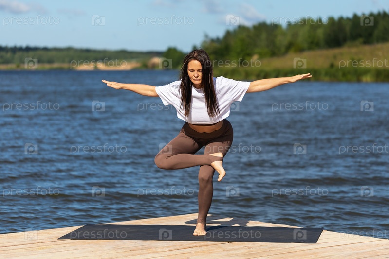 Женщина, практикующая йогу, выполняет упражнение Эка Пада Агнистамбха Уткатасана, балансирует асану, тренируется в спортивной одежде, стоя на одной ноге на деревянном мосту на берегу озера