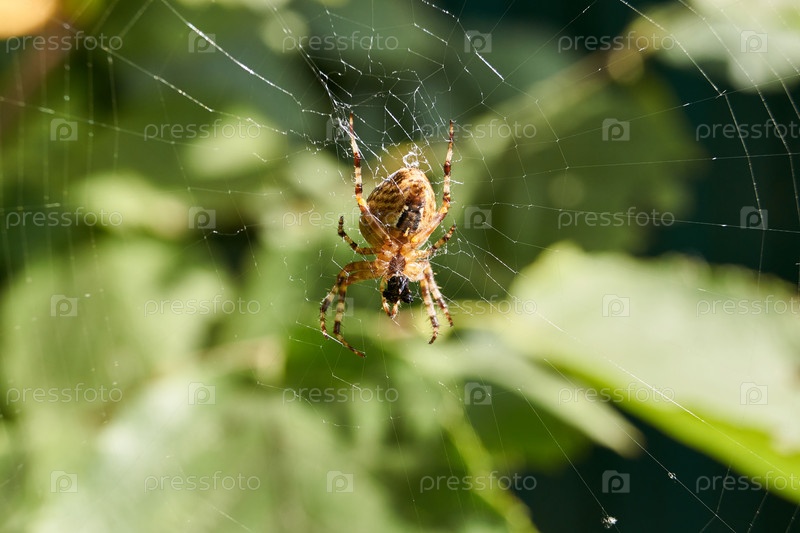 Аранеус сидит в центре паутины и ждет добычи, запутавшейся в паутине