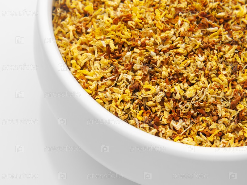 Сушеные цветы османтуса в белой миске на белом фоне. Крупный план, четверть чаши. вид сверху и сбоку. Травяной медицины. Лечебный чай