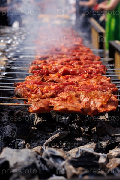 Мясо на шпажках обжаривается на гриле. Еда на ярмарке