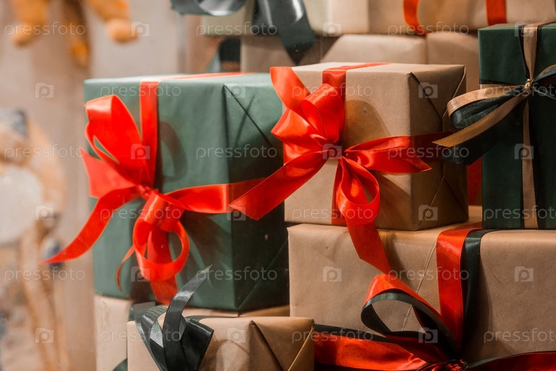 Красивые рождественские подарочные коробки с бантами в комнате. Место для копирования