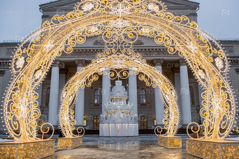 Новый год. Новогодние украшения на улицах Москвы. Рождественские праздники, зимний пейзаж. Большой театр в центре Москвы. Россия, Москва, 2023 г