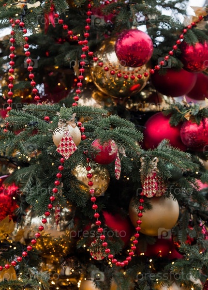 Москва, площадь Революции. Новогоднее украшение улиц. Красивые праздничные украшения на елку в красных и золотых традиционных цветах. Новогодняя открытка 2024