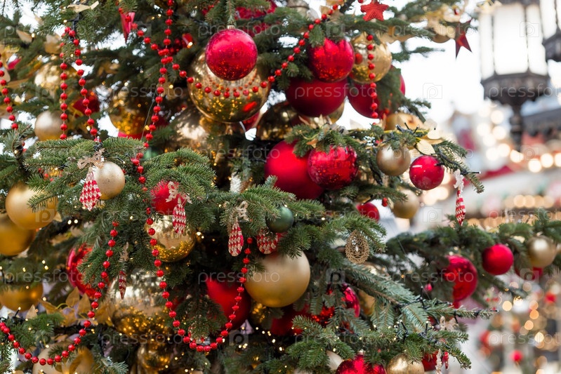 Москва, площадь Революции. Новогоднее украшение улиц. Красивые праздничные украшения на елку в красных и золотых традиционных цветах. Новогодняя открытка 2024