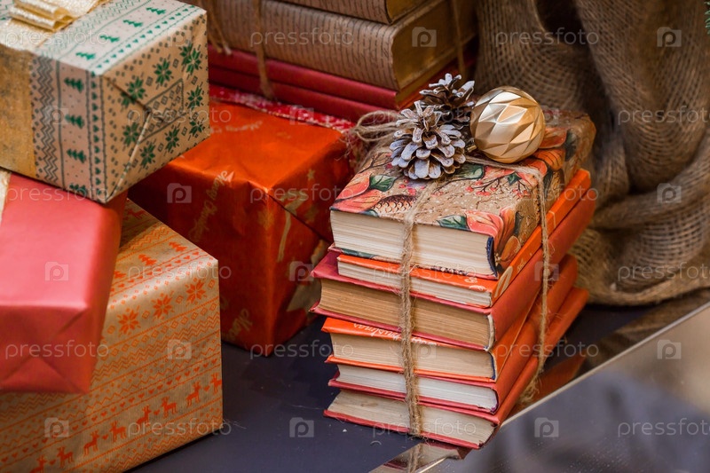 Книги сложены вокруг новогодних подарков. Книга - лучший подарок на праздник. Новогодний фон для книжного магазина
