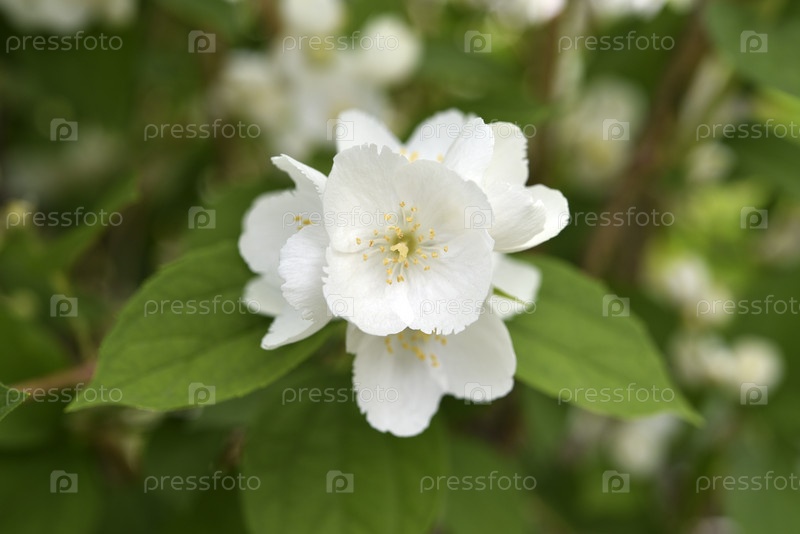 Белые цветы жасмина на зеленом кусте. Крупные цветы гортензии. Гортензиевые. Филадельф
