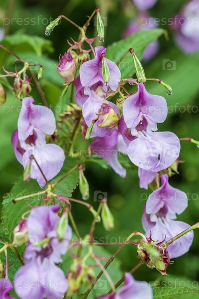 Фиолетовые цветы на фоне зеленых листьев
