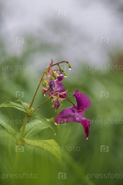Фиолетовый цветок с каплями воды на зеленом фоне