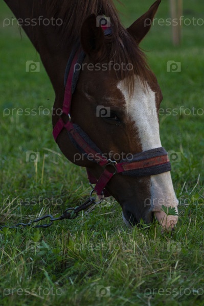 Губами лошадь обхватывает траву, а затем аккуратно откусывает