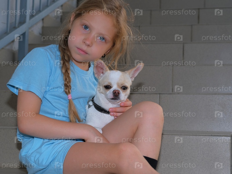 Девочка в бирюзовом костюме с любимой собачкой чихуахуа