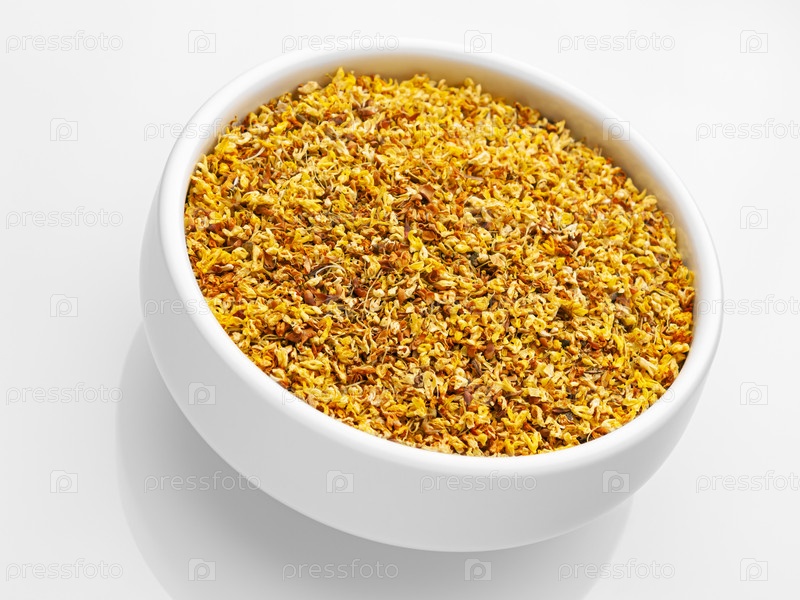 Сушеный ароматный османтус в белой миске на светлом фоне с отражением. Наклон. Изолировать. Боковой вид сверху. Горизонтальный