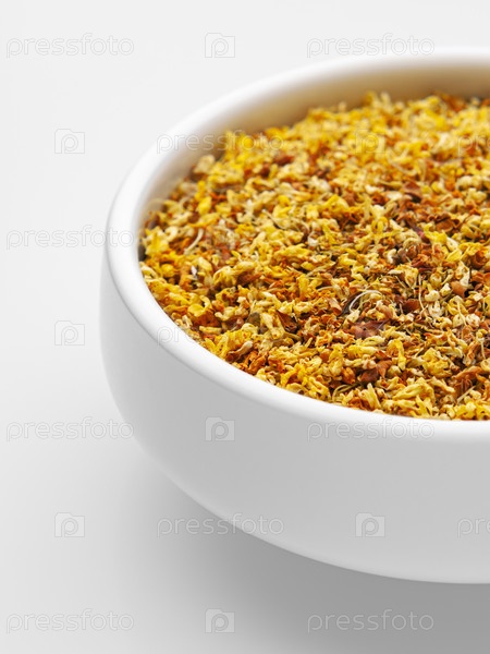 Сушеные цветы османтуса в белой чашке на светлом фоне. Горизонтальный снимок, чашка пополам. Крупный план. Выборочный фокус