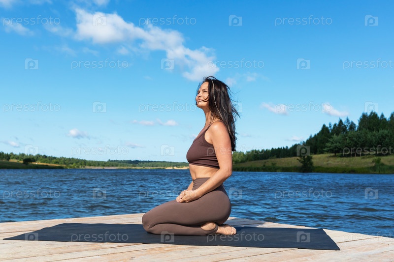 Счастливая женщина, тренер по йоге в спортивной одежде, сидит босиком на коврике у озера, довольная перед началом тренировки на природе