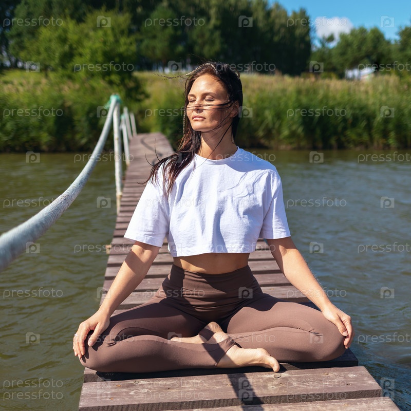 Женщина занимается йогой, медитирует, сидя в позе лотоса на деревянном мосту у озера, тренируется в спортивной одежде
