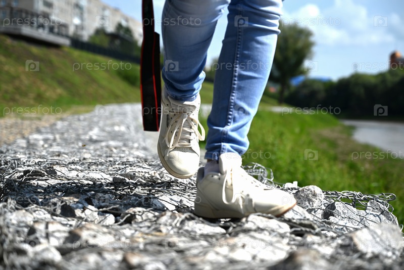 Женщина-фотограф с камерой в руках ходит по улицам города