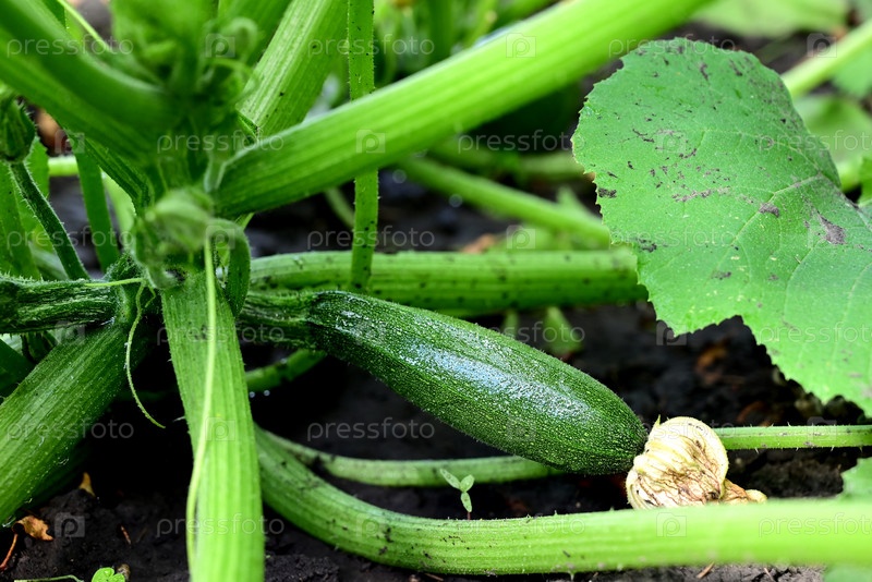 Зеленые молодые цуккини с желтым цветком на летней кровати. Зеленая тыква в овощном поле. Садовый фон с кабачками в открытом грунте, крупным планом