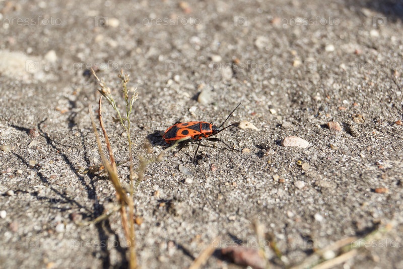 Клоп-солдат (лат. Pyrrhocoris apterus) бежит по своим делам по дорожке в саду