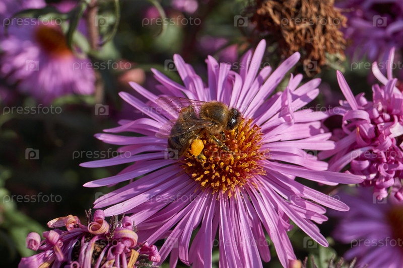 Пчела (лат. anthophila) собирает нектар и пыльцу из цветов многолетней астры