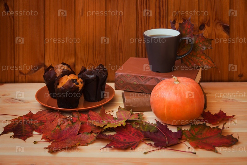 Кофе, осенние кленовые листья, тыква, книги и ванильные кексы на деревянном столе