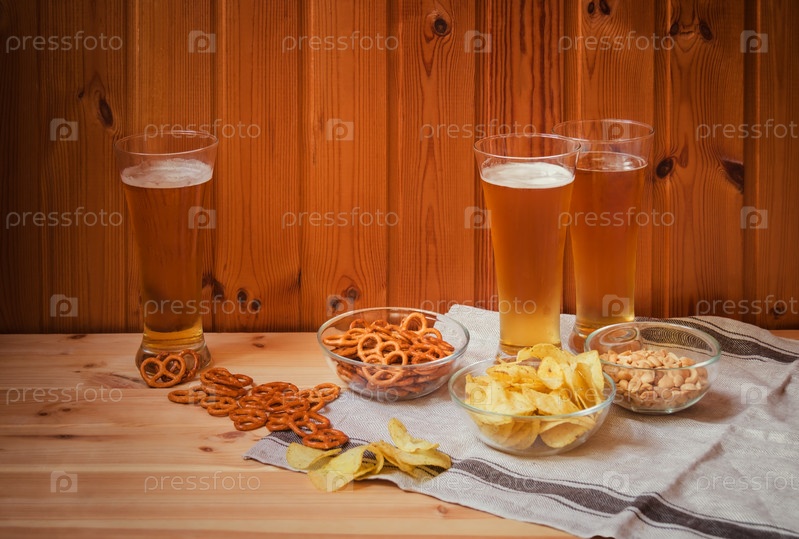 Три стакана светлого пива с солеными кренделями, картофельными чипсами и арахисом на деревянном столе
