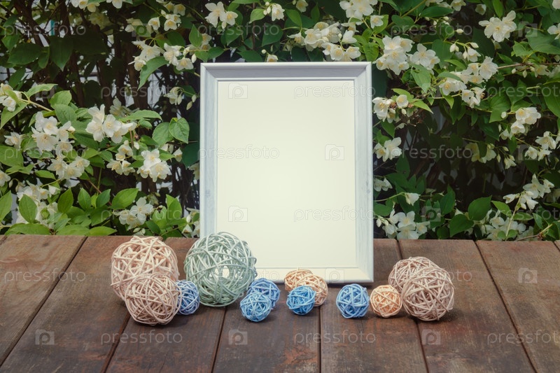 Пустая белая рамка и декоративные шары на старом деревянном столе на фоне свежих цветов жасмина
