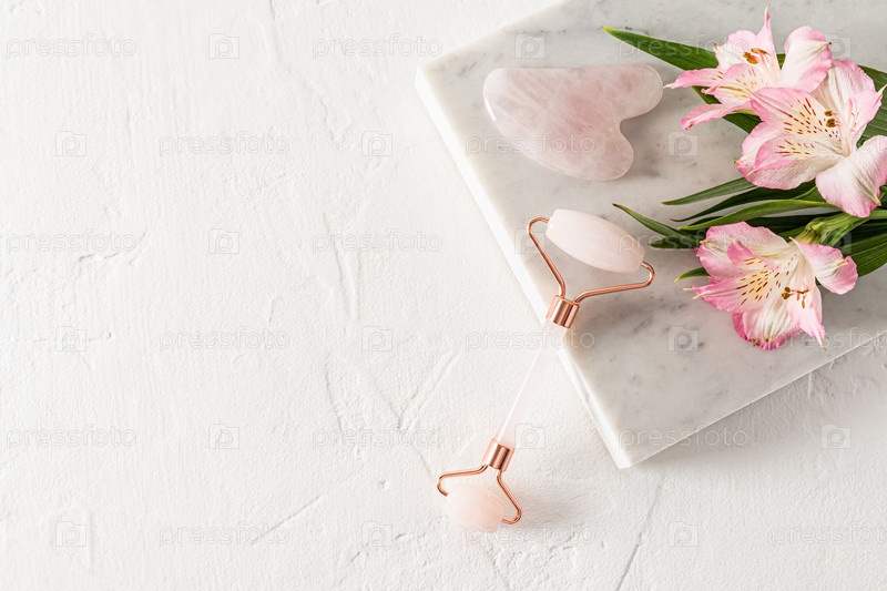 Домашний кварцевый роликовый массажер и скребок гуаша лежат на белом мраморном подиуме с цветами. белый фон. Пространство для копирования. натуральный уход