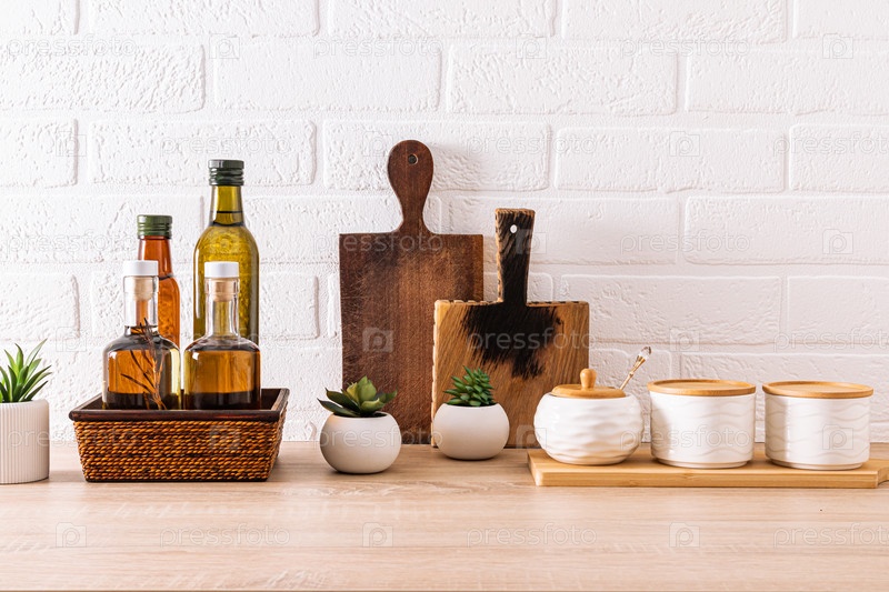 Красивый кухонный фон с местом для хранения различных масел в бутылках. разделочные доски. Комнатные цветы в интерьере кухни. Компактное хранение