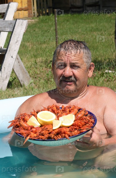 Радостный усатый мужчина сидит в бассейне. В руках он держит большое блюдо с вареными раками. Раки украшают дольками лимона. Крупный план