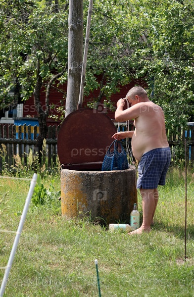 Мужчина с обнаженной грудью в шортах вытаскивает из колодца авоську