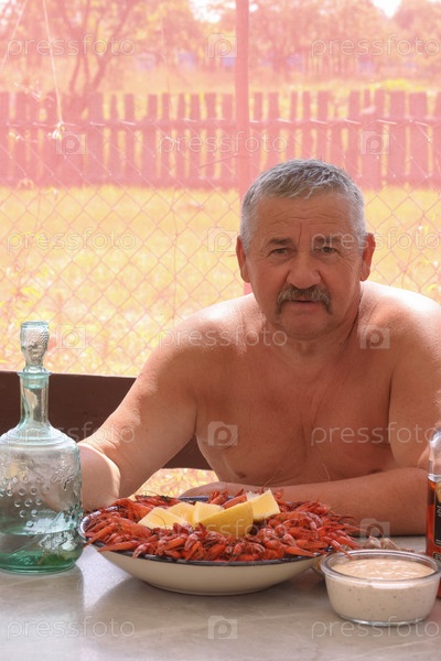 Радостный усатый мужчина сидит в бассейне. В руках он держит большое блюдо с вареными раками. Раки украшают дольками лимона. Крупный план