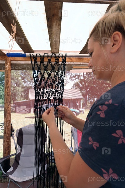 Женщина плетет авоську из полимерного шнура. Сетка для покупок в домашних условиях