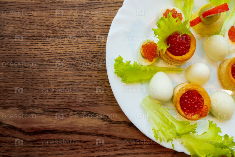 Фон красной икры на деревянной поверхности dsrk. картофель с красными яичками