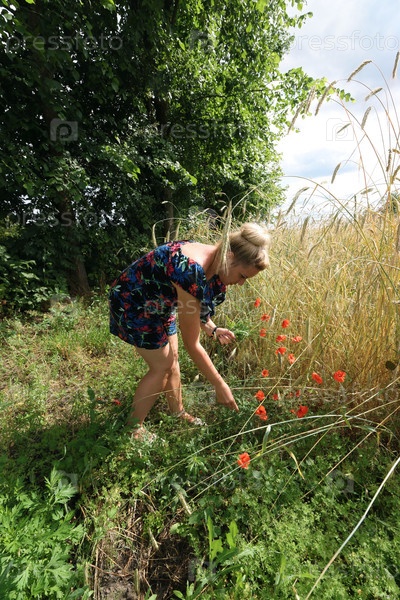Женщина и красные маки. На природе рядом с пшеничным полем