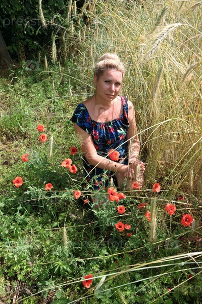 Женщина и красные маки. На природе рядом с пшеничным полем