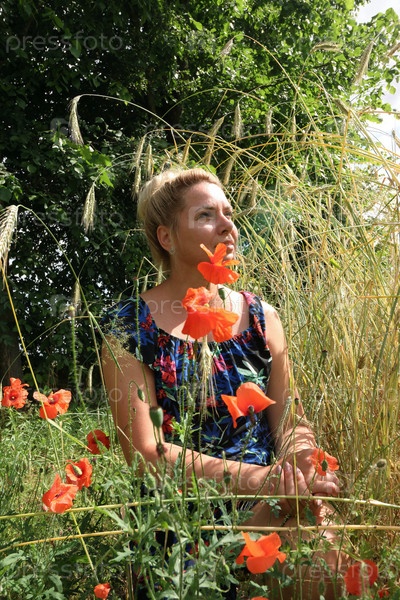 Женщина и красные маки. На природе рядом с пшеничным полем