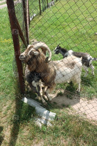 Горный козел с закрученными рогами. В вольере зоопарка. Крупный план