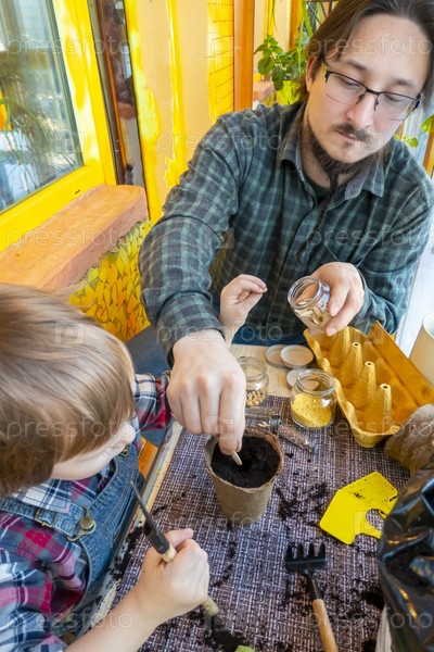 Отец помогает сыну посадить семена в торфяной горшок