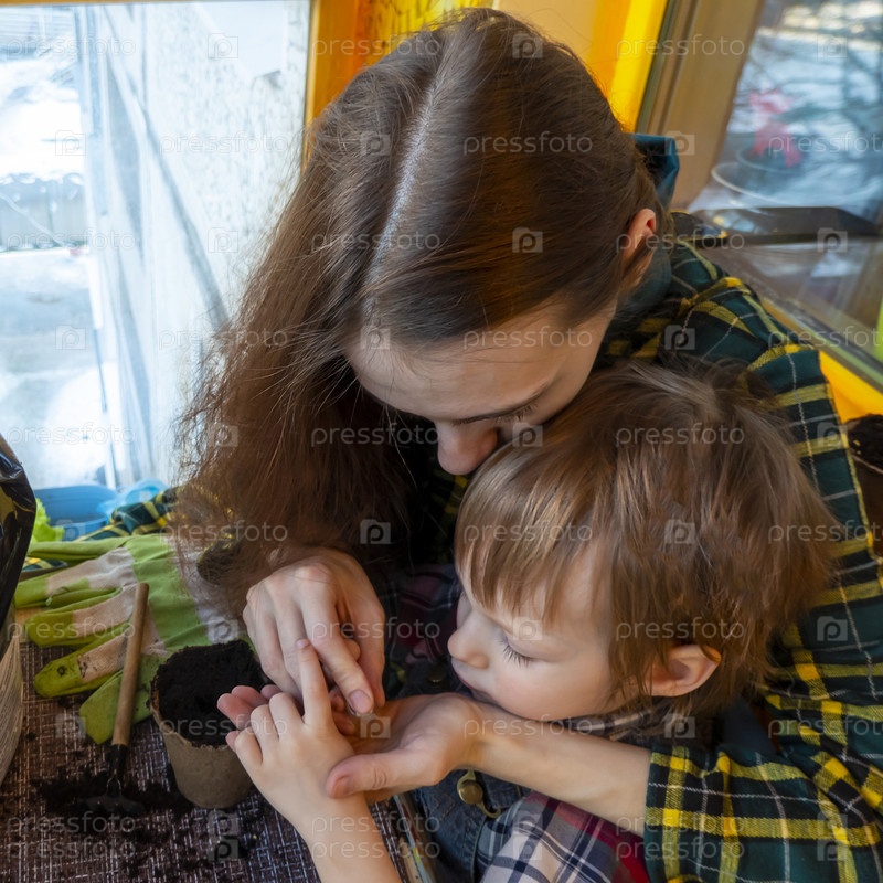 Мама и сын готовят лунку и сажают семена в торфяной горшок