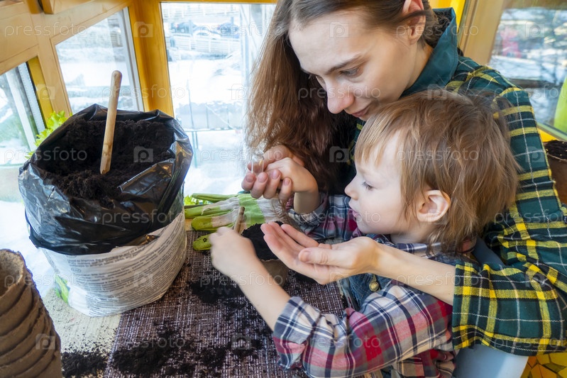 Мама и сын готовят лунку и сажают семена в торфяной горшок